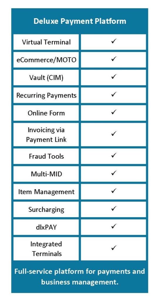 Additional Deluxe Payment Platform products and processing options include dlxPAY mobile application and standalone terminals.